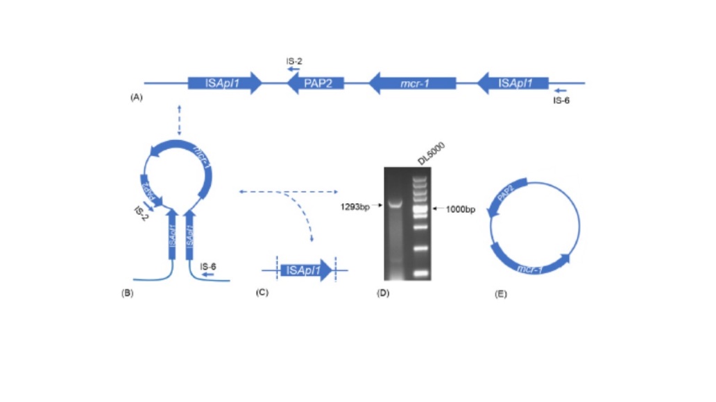 Il gene mcr-1, responsabile della resistenza alla colistina, è stato identificato per la prima volta in un ceppo di Escherichia coli isolato in Cina e da allora è stato riportato solo in Klebsiella pneumoniae e Salmonella enterica.