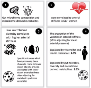 Lo studio, condotto su una coorte 617 donne di mezza età, ha evidenziato che la PWV era negativamente correlata all’eterogeneità del microbioma intestinale. Le associazioni tra la quantità di microrganismi, la diversità microbica e la PWV sono rimaste significative anche dopo l’aggiustamento per i livelli dei metaboliti derivati dall’intestino (acido indol- proprionico, ossido di trimetilammina e fenil-acetil-glutammina). I risultati dello studio mostrano che le caratteristiche del microbioma erano alla base dell’8,3% della variazione della velocità dell’onda del polso (PWV), mentre la resistenza all’insulina combinata con il grasso viscerale ne spiegava solo l’1,8%. Lo studio ha ipotizzato che l’effetto della composizione del microbioma intestinale sulla PWV sia probabilmente dovuto al suo ruolo nella modulazione dell’infiammazione sistemica e che solo una parte di questo effetto venga captato misurando la proteina C-reattiva, l’insulino-resistenza e i fattori di rischio tradizionali per le malattie cardio-vascolari.