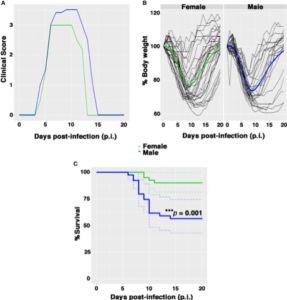 Lo studio, pubblicato recentemente su Frontiers in Immunology, ha evidenziato che topi femmina erano meno sensibili dei maschi al virus dell’influenza adattato (A/PR8 /H1N1), infatti le femmine con infezione da PR8 mostravano un tasso di sopravvivenza più elevato (+ 36%), un decorso della malattia più lieve ed una minore perdita di peso. Le femmine mostravano anche segni istopatologici più lievi ed una carica virale inferiore. L’analisi dei